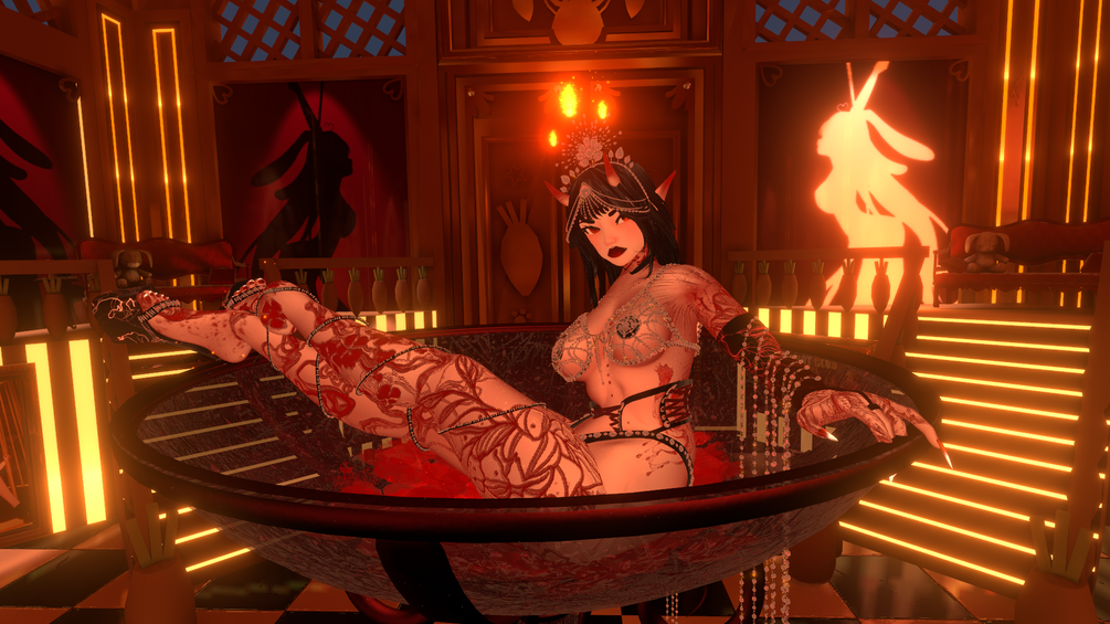 - Entire outfit made from scratch by me Ressonae#6917; Hair, top, sleeves, tassels, jeweled crown, horns, heels, martini Glass! Every custom scratch made item has its own personalized texturing through substance painter! Customized fire particles and feet sparkles by me using ravios particle shader; they are not to be used else where. NONE of these are for redistribution in any way. Please do not take these assets.