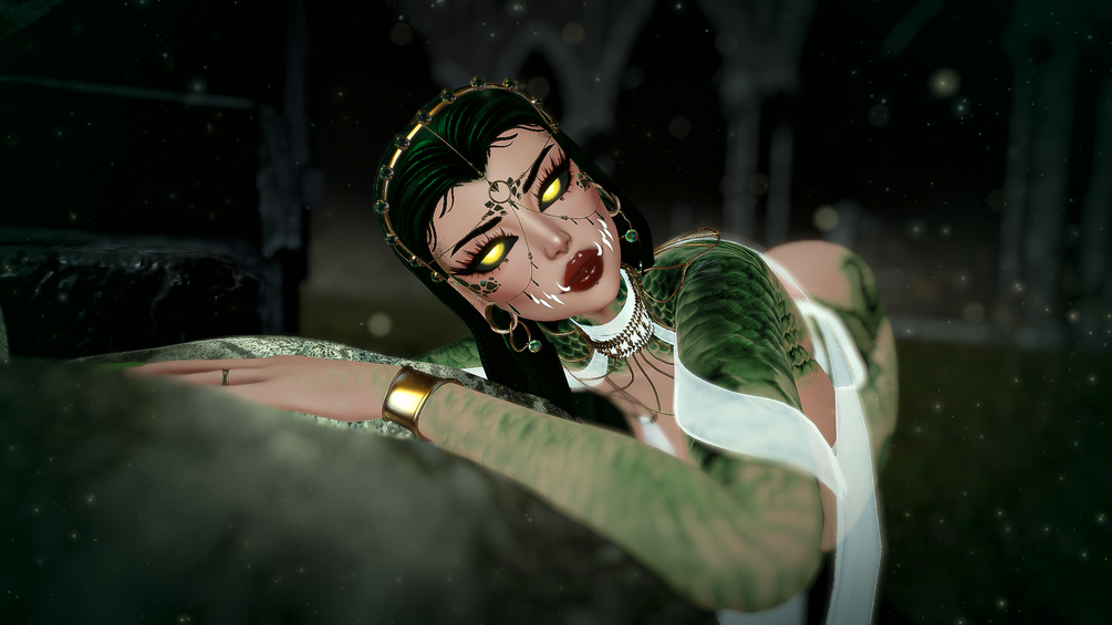 Entire outfit made from scratch by me Ressonae; Long snake hair, Full snake hair, Head piece with gemstones, Head teefs, Pierced tongue, Choker statement piece, Draped long hood, Dainty cloth arm pieces, Cloth top, Waist cloth, Cloth dress attachment, Spicy bottoms, Gold leg wrap, High heels, Snake tail, Big snake friend, ALL accessories; piercings, jewelry etc. Every item is personalized and textured by ME through substance painter! NONE of these are for redistribution in any way. Please do not take these assets or any of the credited assets above that I have edited..